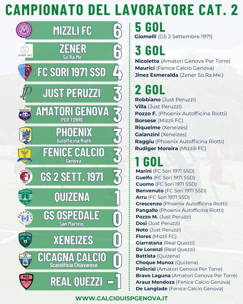 Si è chiusa la seconda giornata del Campionato del Lavoratore Categoria 2 col posticipo tra GS Ospedale San Martino e Zener So.Ra.Me., che vince di misura grazie al terzo centro stagionale di Jinez Esmeralda e aggancia il Mizzli FC in testa alla classifica a quota 6 punti.