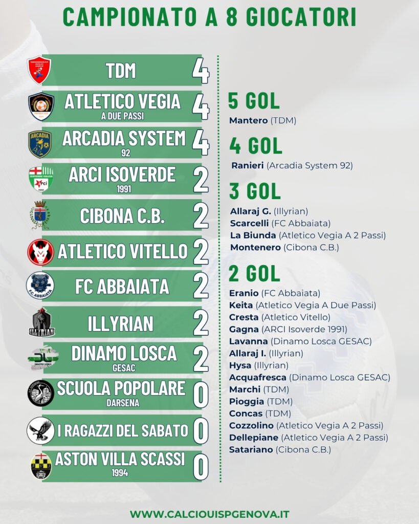 Al quinto posto troviamo il Cibona C.B. vittorioso, con un altro 4-3 molto tirato, contro l’Illyrian. Al sesto posto, a seguire, ecco l’Atletico Vitello che supera la Scuola Popolare Darsena col risultato di 4-2. Completano il quadro FC Abbaiata, Illyrian e Dinamo Losca Gesac, già menzionate in precedenza. Ancora senza punti Scuola Popolare Darsena, I Ragazzi del Sabato e Aston Villa Scassi 1994.