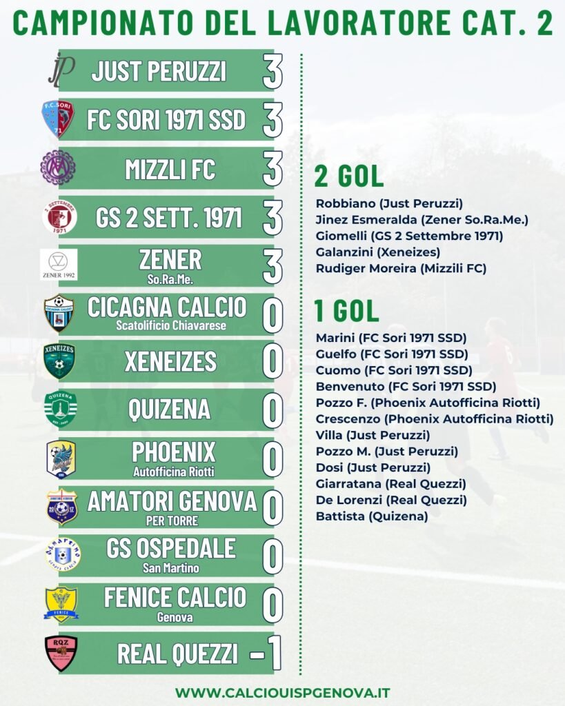 Tre punti li coglie subito anche l’FC Sori 1971 SSD Srl. Cuomo, Marini, Guelfo e Benvenuto confezionano il 4-2 sul Phoenix Autofficina Riotti, a cui non bastano Pozzo e Crescenzo. Una vittoria con due reti di scarto è anche quella che maturerà tra Real Quezzi e Amatori Genova Per Torre: Giarratana e De Lorenzi regalano il 2-0 ai rosanero, che erodono subito tre punti dall’iniziale -4 in classifica e si trovano, di conseguenza, a -1, chiamati a riposare il prossimo turno.