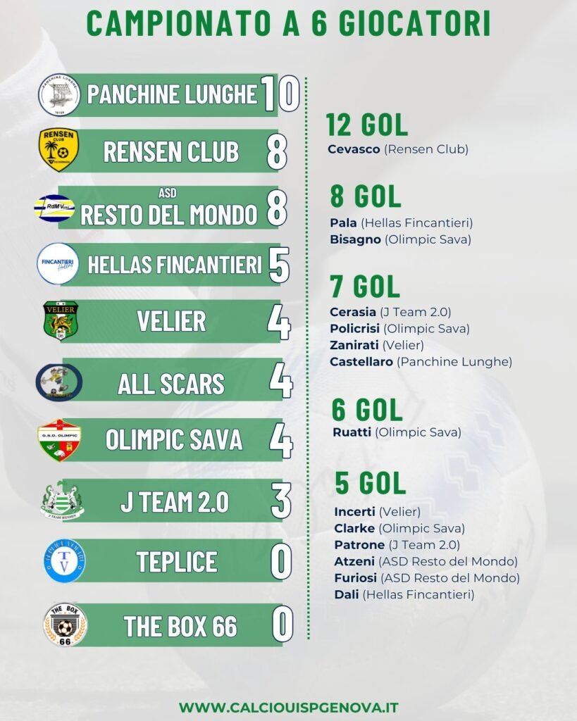 La quinta giornata del Campionato a 6 Giocatori lascia invariate le distanze in testa alla classica, dove Panchine Lunghe procede a punteggio pieno con 10 punti e la quinta vittoria nelle prime cinque. Nell’ultimo turno le reti di Leotta (doppietta), Leanza, Castellaro e Chiossone hanno portato la vittoria per 5-1 sul Teplice.