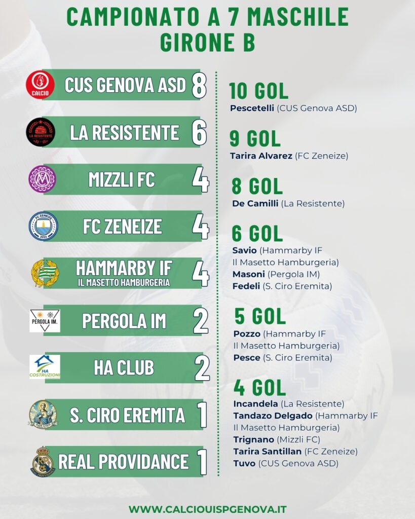 L’analisi della quarta giornata del Campionato a 7 Maschile UISP prosegue nel Girone B, dove figura l’unica formazione a punteggio pieno di tutti e due i raggruppamenti, ovvero sia il CUS Genova ASD. Il capocannoniere Pescetelli, Sironi, D’Amico e per due volte Tuvo permettono di conseguire la vittoria per 5-0 sul Mizzli FC, che (una gara in meno) fallisce l’aggancio in classifica alla nuova capolista, ora salita a 8 punti.