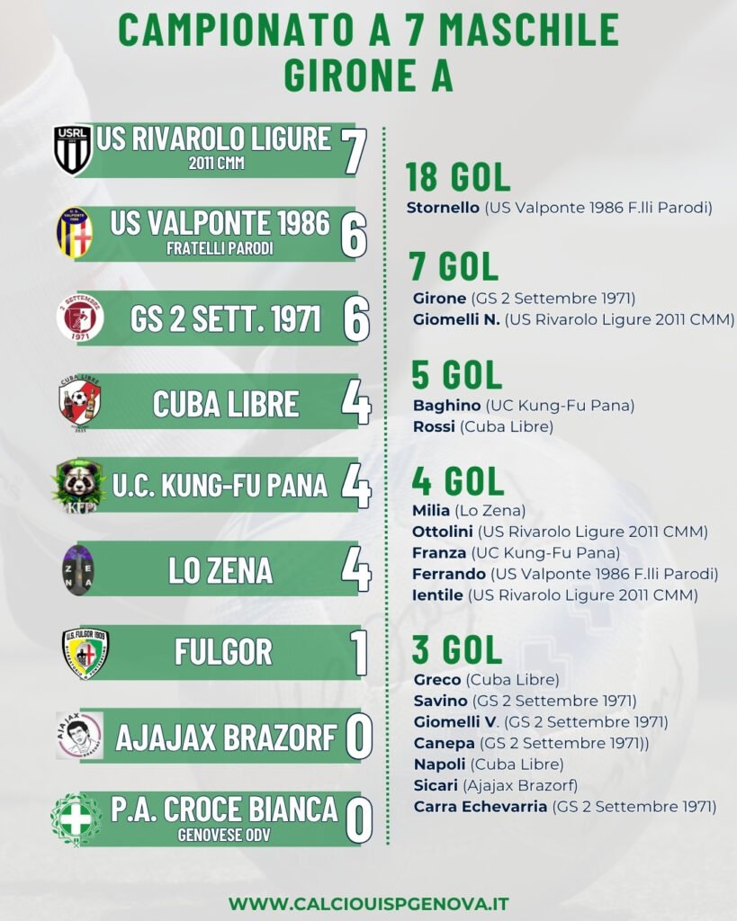 Dopo il resoconto del Campionato a 7 Femminile UISP, focalizziamoci su quanto accaduto nel Campionato a 7 Maschile nei suoi due Gironi A e B. Andando con ordine, nel raggruppamento A mantiene la testa l’US Rivarolo Ligure 2011 CMM, che supera 12-0 Lo Zena grazie alle due triplette di Ientile e Giomelli, la doppietta di Raia e le singole marcature di Vassallo, Ottolini, Barisone e Palma.