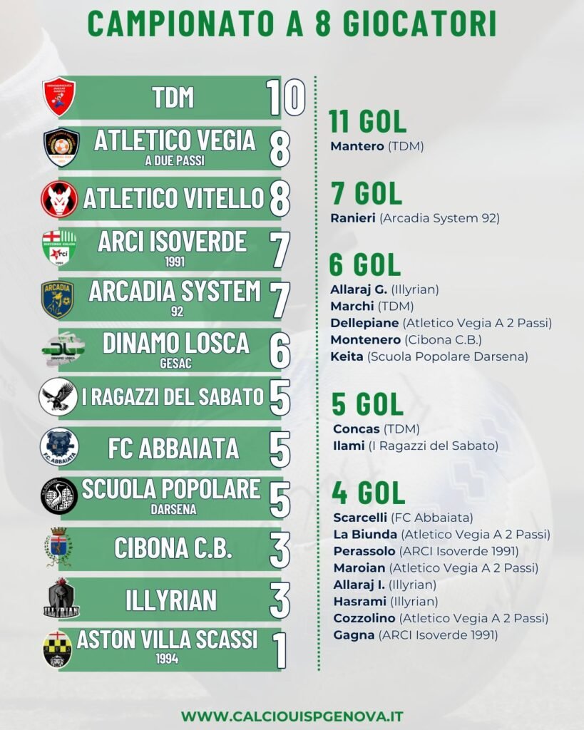 Alla coppia all’inseguimento del TDM formata da Atletico Vegia A 2 Passi e Atletico Vitello, entrambe a 8 punti, si aggiungono a quota sette sia l’ARCI Isoverde 1991 (vincente 5-1 sul Cibona C.B.) e l’Arcadia System (vittorioso 2-0 sulla Dinamo Losca, superata in classifica).