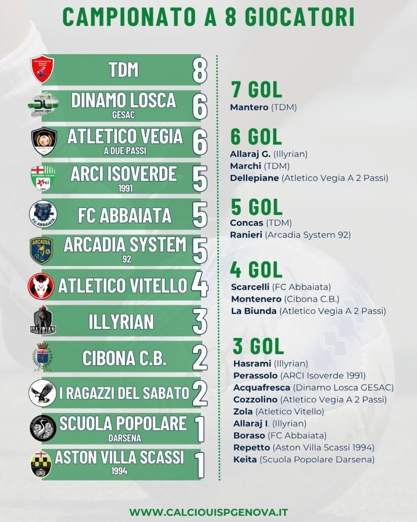 Quarta giornata in archivio per il Campionato a 8 Giocatori organizzato da UISP a Villa Gavotti. I primi quattro incroci ci restituiscono una classifica che vede a comando, in solitaria, la TDM. A permettere l’allungo a +2 in classifica è la vittoria per 6-1 sui Ragazzi del Sabato (tripletta di Concas, doppietta di Marchi e singolo gol di Mantero) e il contemporaneo scontro diretto tra Dinamo Losca Gesac e Atletico Vegia A 2 Passi, le due seconde della classe.