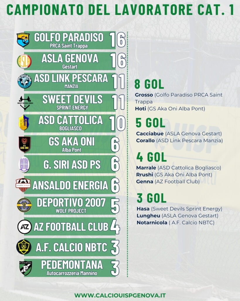 E se l’ASD Cattolica Bogliasco va in doppia cifra di punti e tocca quota 10 proprio nel turno che precede lo scontro diretto con una delle dirette inseguitrici, dai sei punti in giù si rimescola parecchio la classifica. “Spariglia” le carte in tavola la prima vittoria stagionale dell’AZ Football Club nel segno di Genna (doppietta), Casu e Catta, che permettono di vincere 4-0 sul campo della Pedemontana Autocarrozzeria Mannino. Questo risultato, sommato al 2-2 tra A.F. Calcio NBTC e Deportivo 2007 Wolf Project, restituisce la classifica che trovate qua sotto, con ben sette squadre in tre punti tra la sesta e la dodicesima posizione. in altre parole: tutto apertissimo!