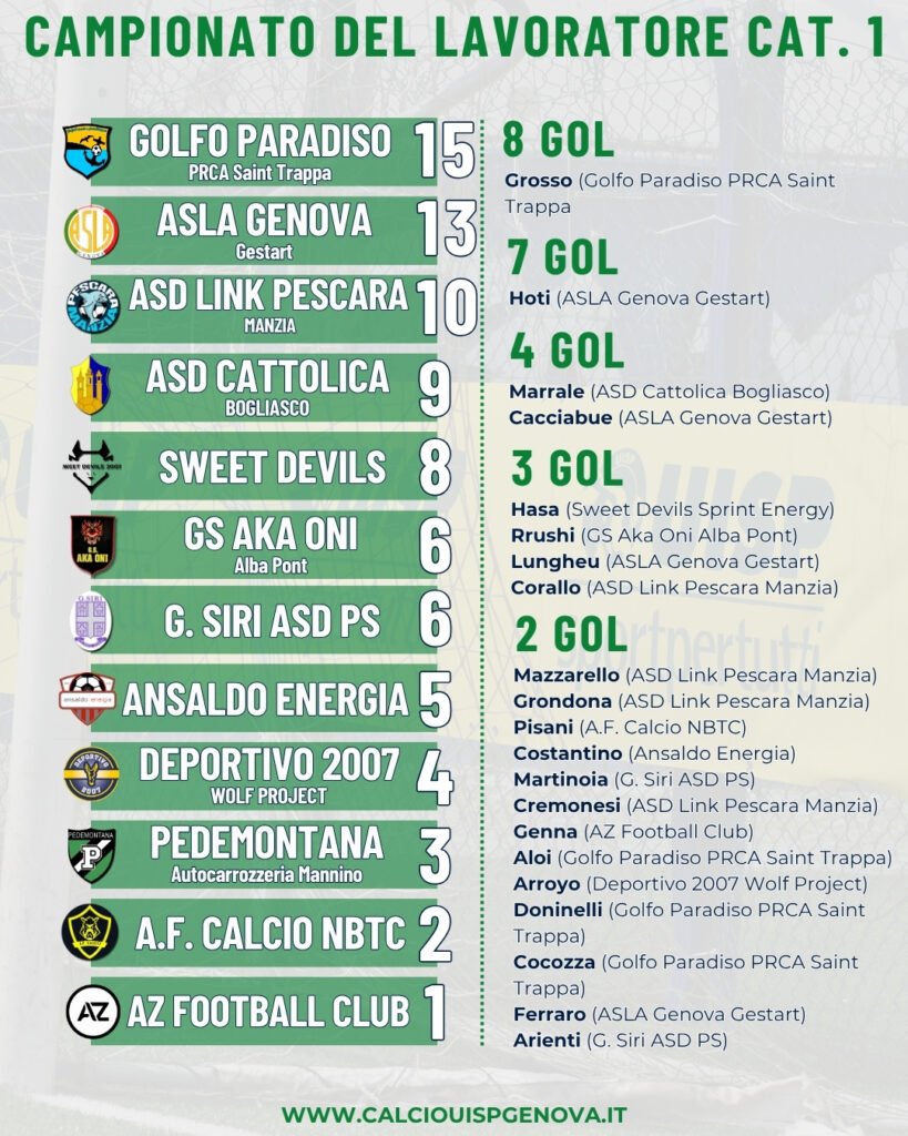 Il quinto turno del Campionato del Lavoratore Categoria 1 ha regalato un altro successo che, alla luce dei pareggi per 2-2 tra G. Siri ASD PS e AF Calcio NBTC per 1-1 tra Deportivo 2007 Wolf Project e Pedemontana Autocarrozzeria Mannino, assume uno spessore differente. È la vittoria esterna per 1-0 dell’Ansaldo Energia sul campo dell’AZ Football Club, ancora a secco di vittorie. Balzo di tre o quattro posizioni per la squadra di Bisaccia, autore del gol vittoria. Di seguito classifica punti e marcatori aggiornata: