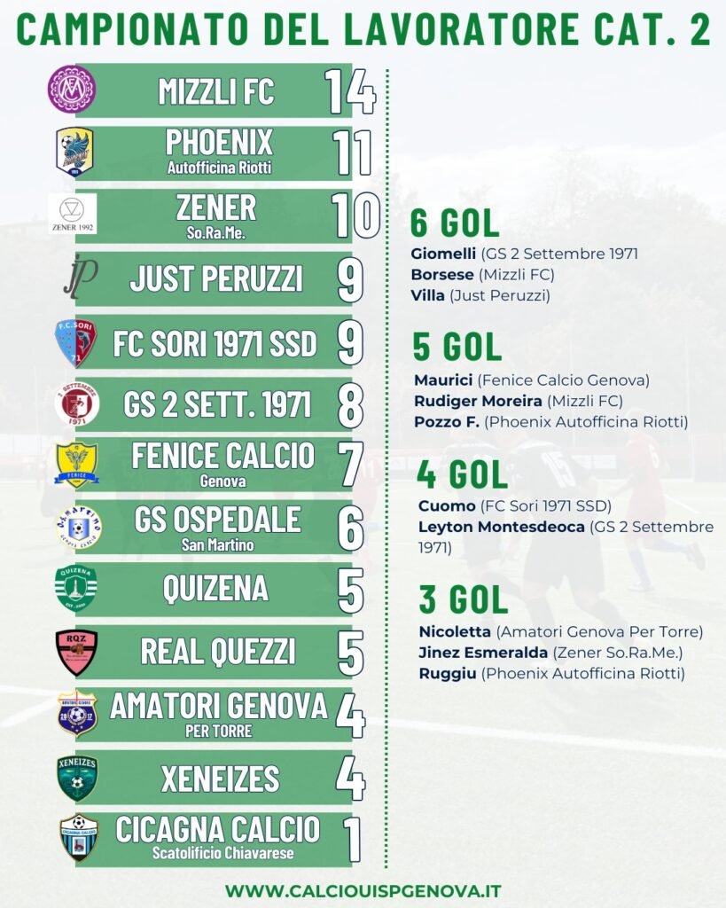 Provano a riavvicinarsi alla parte più alta della graduatoria Fenice Calcio Genova e GS Ospedale San Martino. La prima pareggia 1-1 con gli Xeneizes (al secondo risultato utile di fila), la seconda passa fuori casa sul campo del Cicagna Calcio Scatolificio Chiavarese guidata dalle marcature di Castro Vera, Bruno, Caruso e Sarta. Di seguito classifica punti e marcatori aggiornata: