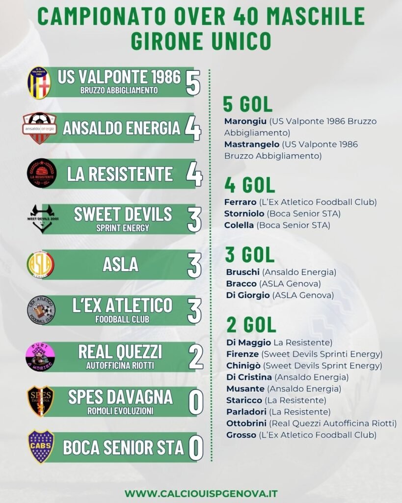 Nell’ultimo turno, poi, è arrivata la prima vittoria del Real Quezzi Autofficina Riotti, che supera 5-2 il Boca Senior STA ad Oregina. Ai padroni di casa non basta la doppietta di Colella. Decisive le reti di Ottobrini (doppietta), Romani, Tusa e Maselli. Di seguito classifica punti e marcatori aggiornata.