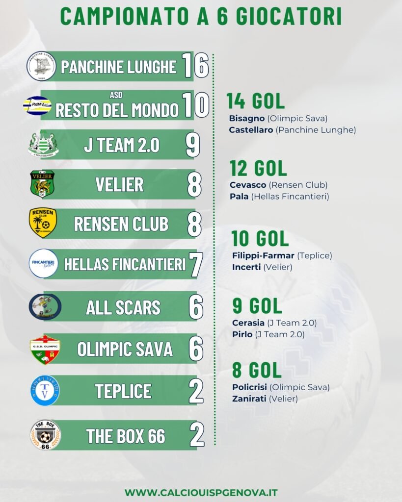 A guidare la classifica a punteggio pieno, con 16 punti, sono le Panchine Lunghe, vincenti per 5-1 sul Rensen Club con ben cinque marcatori differenti: Chiossone, Castellaro, Sangineto, Della Torre e Merello.