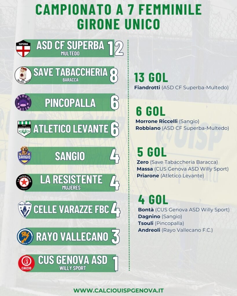 La sesta giornata del Campionato a 7 Femminile organizzato da UISP ha certificato che l’ASD CF Superba Multedo si godrà il Natale in testa alla classifica grazie alla vittoria per 4-1 contro il Pincopalla. In rete Fiandrotti, autrice di un’altra doppietta, seguita da Malavasi e Robbiano.