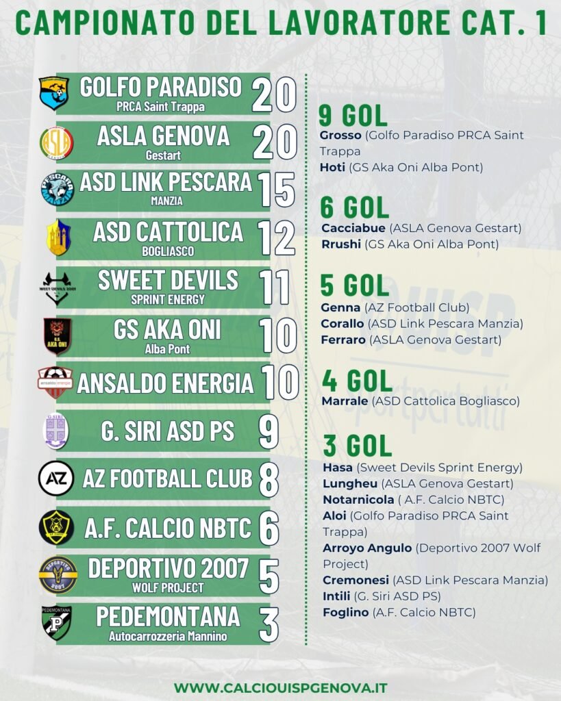 Otto giornate, una sola prima della fine delle partite targate 2025 e una classifica, quella del Campionato del Lavoratore Categoria 1, che si rimescola poco, soprattutto nei piani alti, dove l’ASD Link Pescara Manzia non approfitta del pareggio tra Golfo Paradiso PRCA Saint Trappa e ASLA Genova Gestart (1-1 a Recco con la rete di Grossi a rispondere a quella di Bracco).