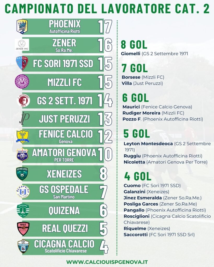 Da segnalare, infine, gli unici due pareggi di giornata: lo 0-0 tra Quizena e GS Ospedale San Martino e l’1-1 tra Xeneizes e Cicagna Calcio Scatolificio Chiavarese. Quella che segue è la classifica punti e marcatori aggiornata. Da venerdì si torna in campo!