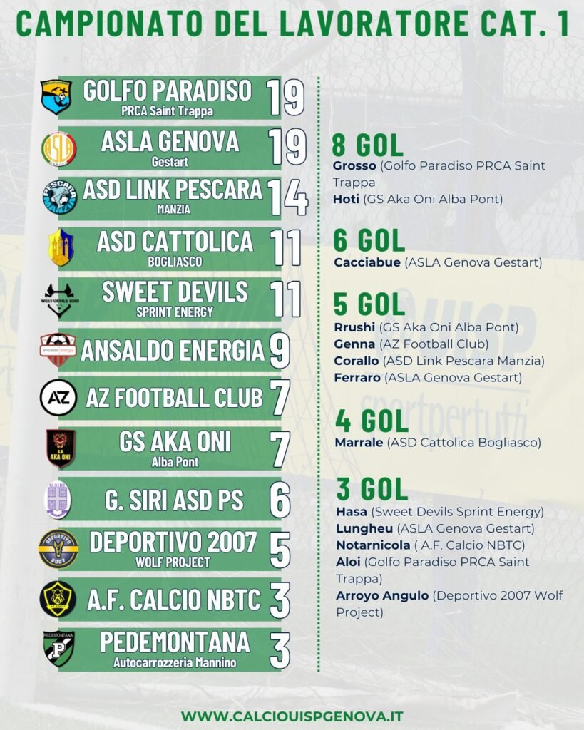 Prendersi una pausa per ripartire ancora più forti e farlo subito alla grandissima, con il big match che metterà di fronte le due capoliste della classifica il prossimo 12 dicembre. Potremmo riassumere così l’ultimo turno del Campionato del Lavoratore Categoria 1, che ha confermato come Golfo Paradiso PRCA Saint Trappa e ASLA Genova Gestart guidino la classifica con 19 punti a testa.