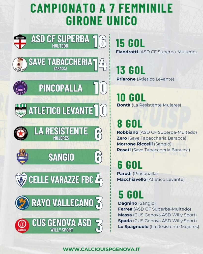 Il Campionato a 7 Giocatrici Femminile organizzato da UISP è arrivato al giro di boa. Alla fine del girone di andata la classifica resta invariata rispetto all’ottava giornata in termini di piazzamenti, ma si acuisce il divario tra le prime quattro e le restanti cinque formazioni del torneo.