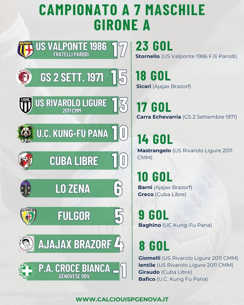 Il Campionato a 7 Giocatori organizzato da UISP entra nel vivo e, al giro di boa tra andata e ritorno, è davvero interessante lo scenario della classifica. Al di là dell’unica squadra che ha riposato un turno in avvio di 2026, ossia l’Ajajax Brazorf, il nuovo anno ha portato in dono una vittoria per GS 2 Settembre 1971 (8-3 sull’US Rivarolo Ligure 2011 CMM), U.C. Kung Fu Pana (2-1 sulla P.A. Croce Bianca Genovese ODV), Cuba Libre (8-2 con la Fulgor) e la capolista US Valponte 1986 Fratelli Parodi (6-1 con Lo Zena). Risultati, quelli appena elencati, che restituiscono la seguente classifica, in attesa che riparta questa sera la seconda giornata di ritorno: