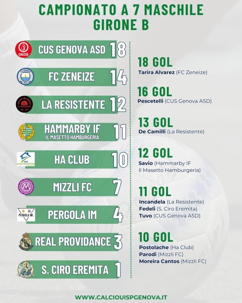 L’avvio del nuovo anno è coinciso, anche nel Girone B, con l’inizio del girone di ritorno. Al netto del turno di riposo osservato dal Mizzli FC, hanno aperto l’anno con una vittoria Ha Club (4-2 contro la Pergola IM), FC Zeneixe (7-3 col Real Providance), la capolista CUS Genova ASD (8-6 con l’Hammarby IF Il Masetto Hamburgeria) e La Resistente (6-2 col S. Ciro Eremita). Questa la nuova classifica punti e marcatori a poche ore dall’undicesima giornata, che proporrà lo scontro al vertice tra prima e seconda della classe: