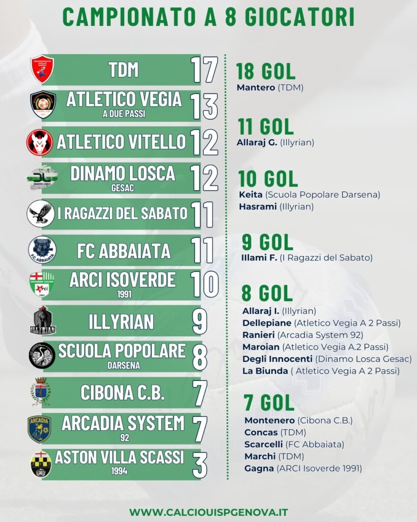 Tra queste la sfida di Villa Gavotti tra la capolista TDM e la Scuola Popolare Darsena. Vince la capolista TDM col punteggio di 3-2: reti di Marchi, Mantero e Rolando. Una vittoria di peso alla luce della sconfitta della seconda della classe, l’Atletico Vegia A 2 Passi, sconfitto dall’Atletico Vitello col punteggio di 4-3 (Cherubini, Puliti, Parodi e Zola i marcatori decisivi).