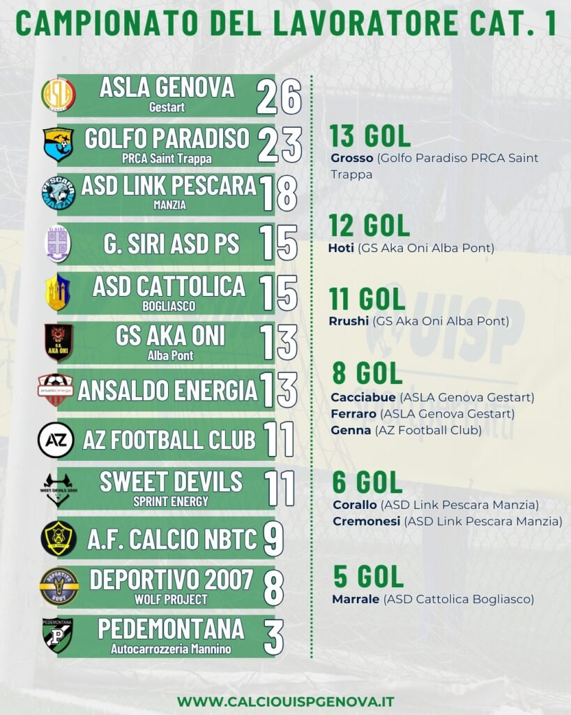 Quota undici, due lunghezze dietro, la toccano infine Genna e compagni con il loro AZ Football Club, che supera 4-2 il Deportivo 2007 Wolf Project al “XXV Aprile”. Tripletta dello stesso Genna, ora a quota otto reti stagionali, e singolo centro di Catta. Di seguito la classifica punti e marcatori aggiornata: