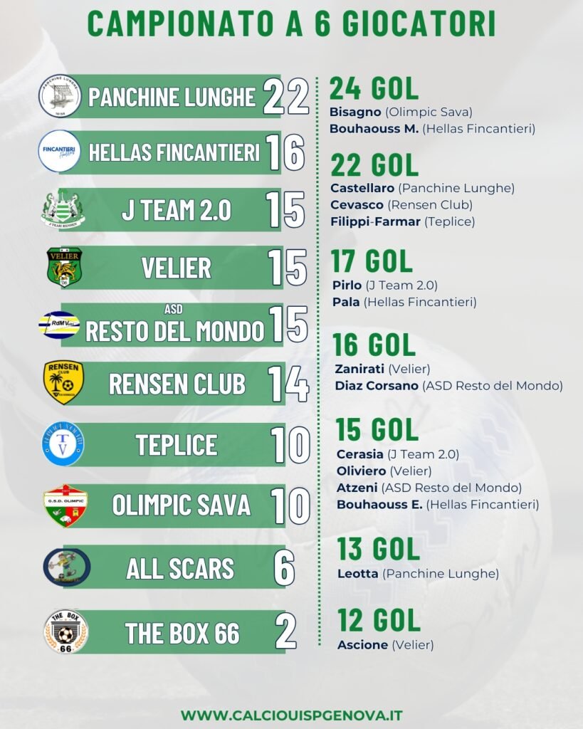 Terzetto di squadre a 15 punti, invece, fra la terza e la quinta piazza. Si tratta di J Team 2.0, Velier e ASD Resto del Mondo. Nel primo caso, il J Team 2.0 dovrà recuperare la sfida coi The Box 66 il prossimo 24 marzo. Nel secondo caso, come già scritto, il Velier ha pareggiato. Nel terzo caso, infine, l’ASD Resto del Mondo ha perso con il Teplice.