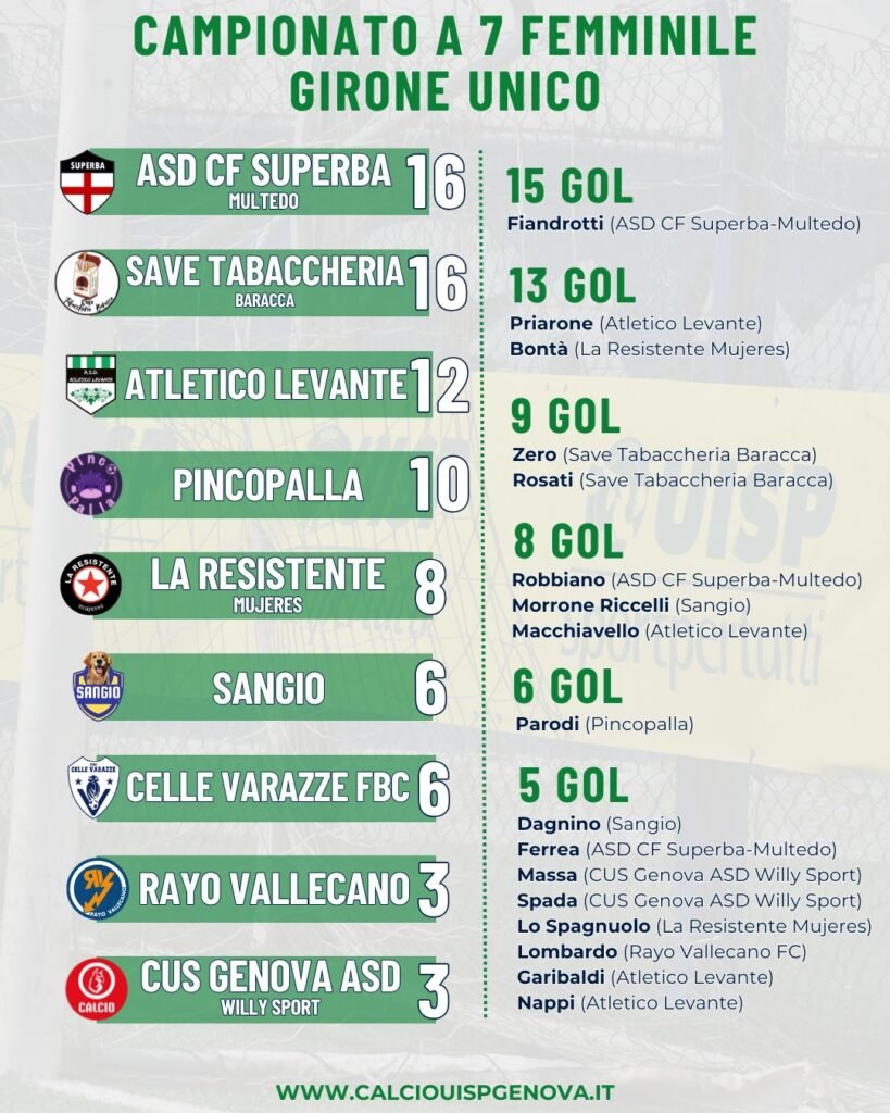 La quarta in classifica, il Pincopalla, ha riposato, mentre La Resistente Mujeres si è presa la quinta posizione con 8 punti vincendo 4-2 sul CUS Genova ASD Willy Sport con tripletta di Bontà e rete di Medina Duarte. A chiudere il quadro della situazione l’aggancio in classifica del Celle Varazze FBC nei confronti del Sangio, battuto 5-3. Anche qui da registrare una tripletta di Maffei unita alle reti di Valle e Tona.
