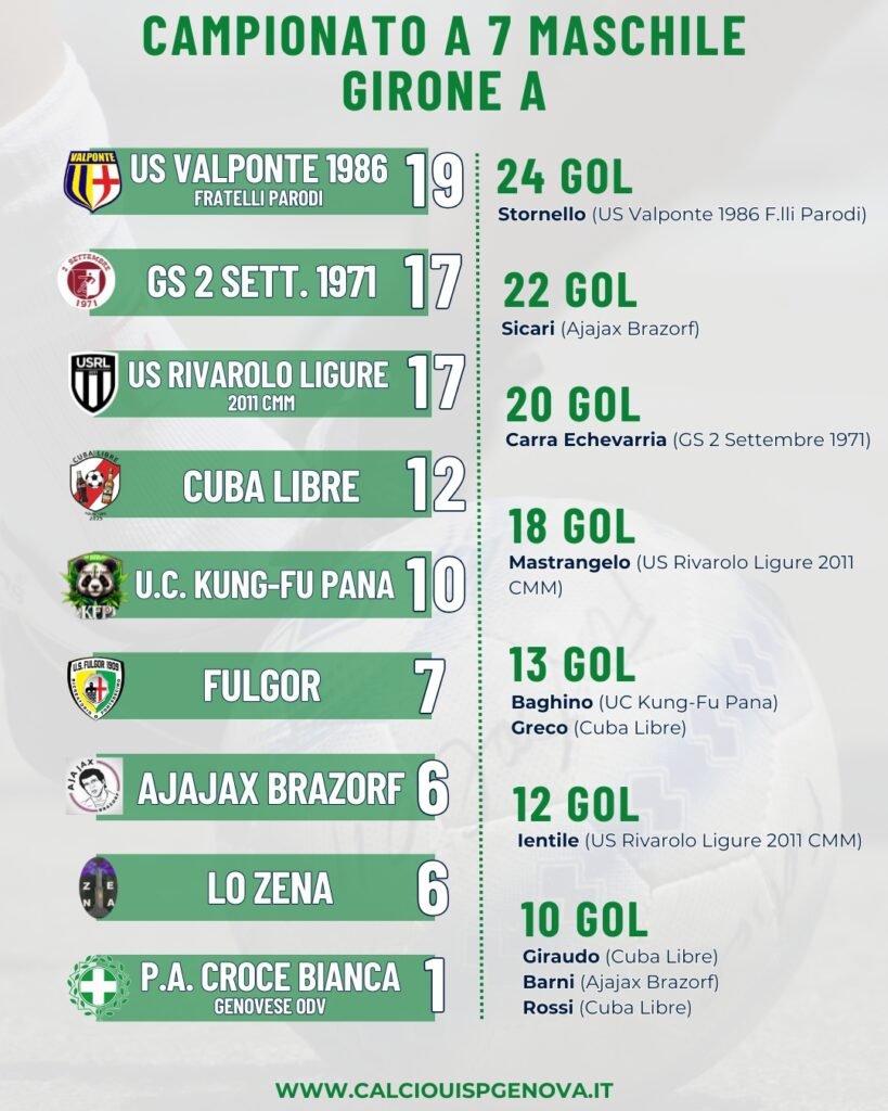 Nel Girone A l’ultimo turno è stato un turno che potrebbe aver indirizzato la classifica verso una fuga delle prime tre della classe. Vincono tutte e tre, dall’US Valponte 1986 Fratelli Parodi (4-0 sull’Ajajax Brazorf nel segno di Stornello, Pittaluga e per due volte Maiello) al GS 2 Settembre 1971 e all’US Rivarolo Ligure 2011 CMM.