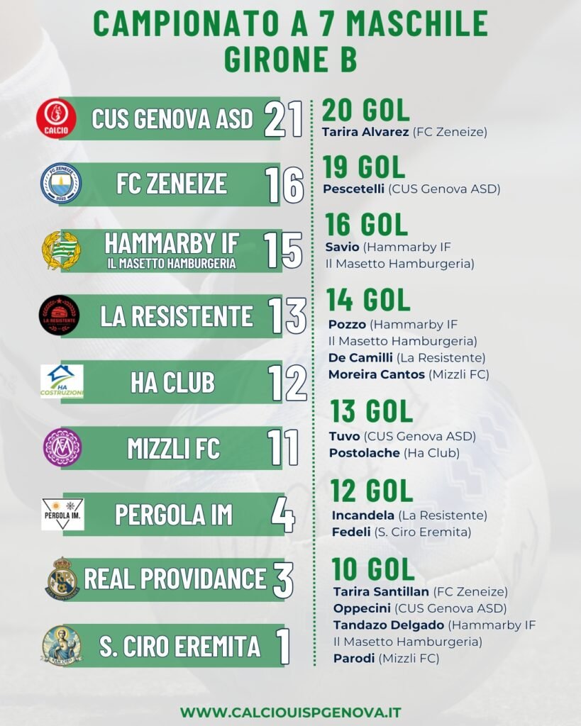Appare quantomeno più aperta la corsa ad almeno due dei tre posti validi per i playoff nel Girone B. L’8-3 del CUS Genova ASD sull’FC Zeneize ha il sapore di un’ipoteca sul primo posto e sulla qualificazione al girone Playoff, che potrebbe diventare matematica tra un paio di giornate se resterà invariato il vantaggio di otto punti sul quarto posto.