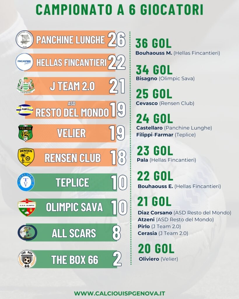 Dopo l’ultimo turno del Campionato a 6 Giocatori organizzato da UISP è definito il quadro delle sei formazioni matematicamente qualificate ai quarti di finale. Si tratta, in ordine di classifica, di Panchine Lunghe (26 punti), Hellas Fincantieri (22 punti), J Team 2.0 (21 punti), ASD Resto del Mondo (19 punti), Velier (19 punti) e Rensen Club (18 punti).