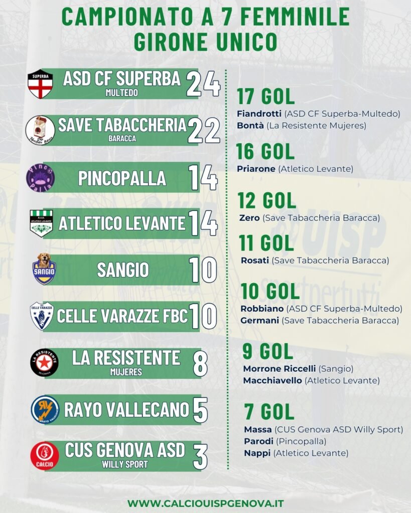 Proseguono nella loro corsa in solitaria in testa alla classifica ASD CF Superba Multedo (vincente 6-1 con l’Atletico Levante nel segno di Belloni, Malavasi, Pinasco, Aloi e due volte Robbiano) e Save Tabaccheria Baracca (6-2 con La Resistente Mujeres grazie alle doppiette di Nasso e Germani e al gol di Rosati, Favali).