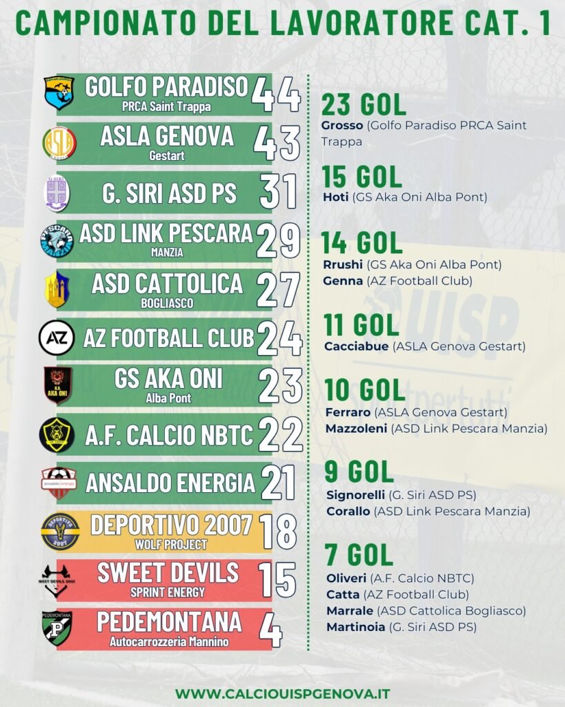 La vittoria del Golfo Paradiso PRCA Saint Trappa per 5-1 sulla Pedemontana Autocarrozzeria Mannino (che aritmeticamente non potrà ricucire il gap con la zona playout ed è sicura del passaggio nel Categoria 2) e quella per 2-1 dell’ASLA Genova Gestart contro un combattivo Deportivo 2007 Wolf Project mantengono invariata la distanza tra la prima e la seconda: un solo punto.