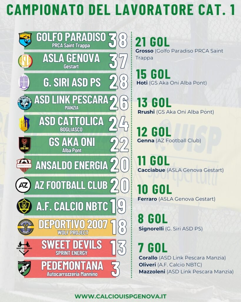 Nel Campionato del Lavoratore Categoria 1 quello appena archiviato è stato un turno nel quale i colpi di scena non sono mancati. Si è fermata la capolista, il Golfo Paradiso PRCA Saint Trappa, sconfitta per 2-1 dal GS Aka Oni Alba Pont trascinato da Rrushi e Mucaj. Cecchi in gol per la capolista.