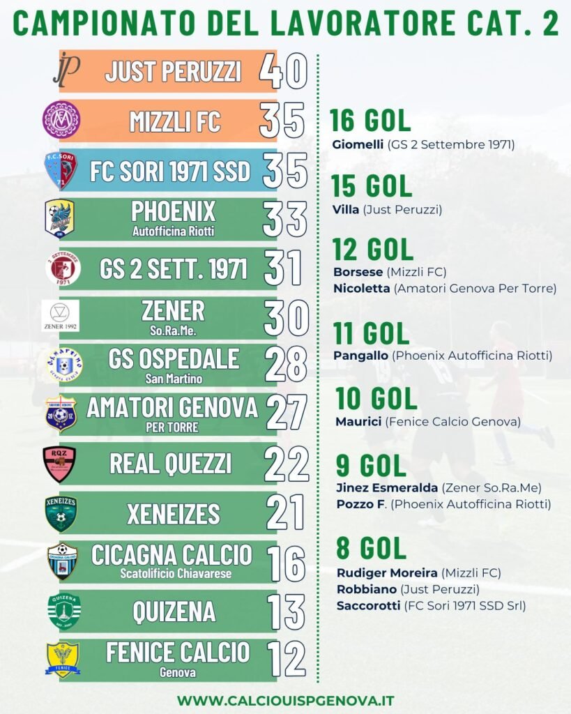 La vetta, quello sì, resta appannaggio da diverse settimane del Just Peruzzi, che vincendo 4-1 sul campo del Cicagna Calcio Scatolificio Chiavarese nel segno di Leka, Noto e Villa (doppietta) si porta a quota 40 punti, allungando a +5 sulle inseguitrici. Va considerato, tuttavia, che i Phoenix Autofficina Riotti (33 punti e una gara in meno) hanno riposato e torneranno in campo nel prossimo turno pre-pasquale, che vedrà osservare una sosta al Mizzli FC, portatosi al secondo posto a 35 punti grazie all’1-0 con la Fenice Calcio Genova. Decisivo Parodi.