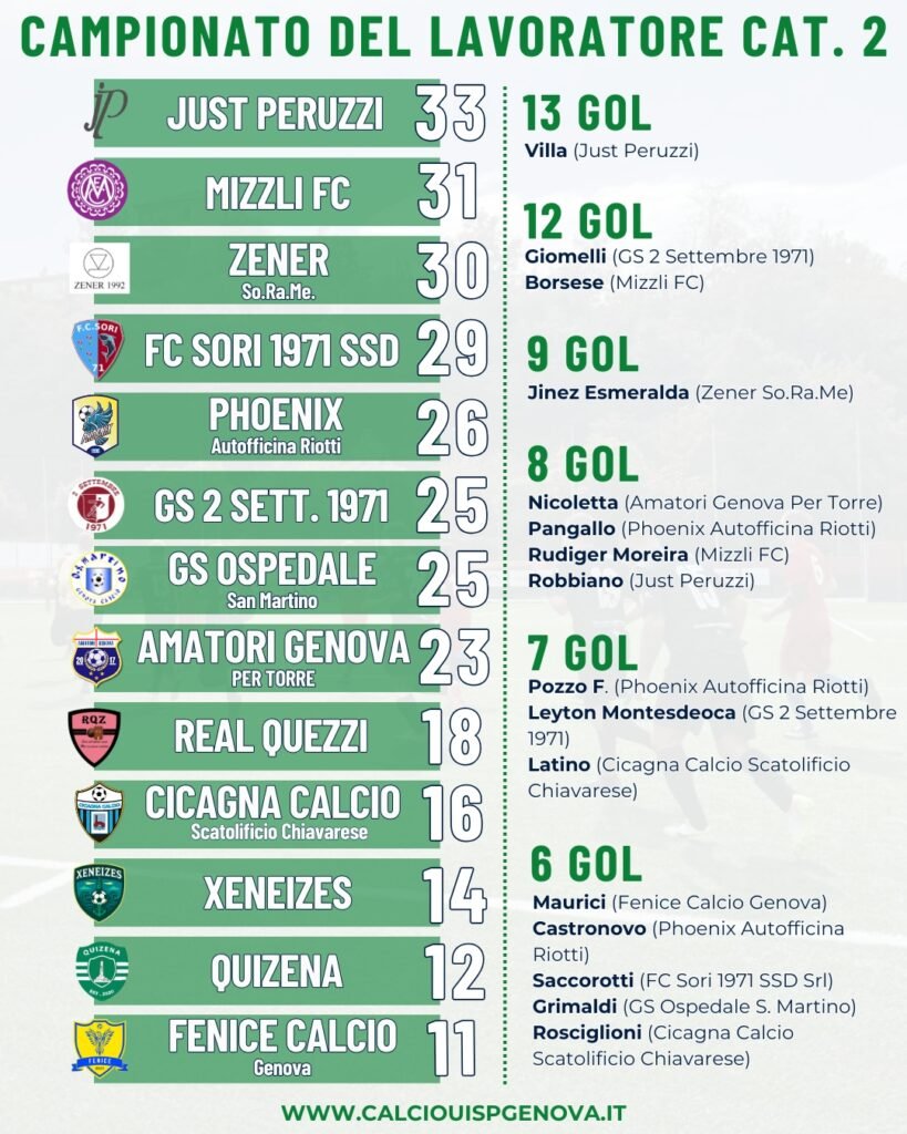 A prendersi la seconda posizione, con 31 punti, è stato il Mizzli FC, che sbanca Cicagna, contro i padroni di casa del Cicagna Calcio Scatolificio Chiavarese, col punteggio di 3-1. Decisive le reti di Ballard, Borsese e Rudiger Moreira. Così come risale nuovamente la classifica lo Zener So.Ra.Me., che sale a 30 punti e scavalca l’FC Sori 1971 SSD Srl, sconfitto 4-2 dagli Xeneizes trascinati da Buccola, Cucaro, Grrica e Riquelme.
