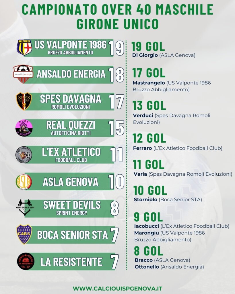 L’ultimo turno del Campionato Over 40 UISP ha portato a tre le squadre matematicamente qualificate ai quarti di finale. All’US Valponte 1986 Bruzzo Abbigliamento, che si è ripresa la testa della classifica vincendo 5-4 con l’Ex Atletico Foodball Club (doppietta di Marongiu e tripletta di Mastrangelo), si sono aggiunte Ansaldo Energia (a riposo) e Spes Davagna Romoli Evoluzioni, forte del pareggio per 1-1 con il Real Quezzi Autofficina Riotti.