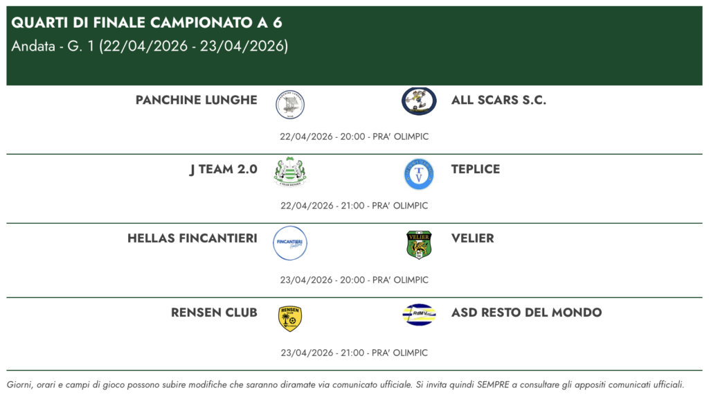 Campionato a 6 Giocatori | Ecco il programma dei quarti di finale