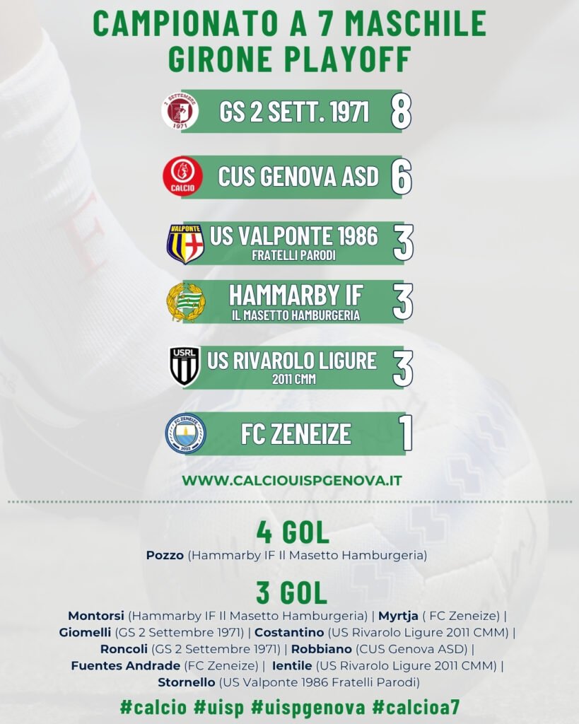 Insegue con 6 punti il CUS Genova ASD, a sua volta vittorioso con l’FC Zeneize. Tripletta di Pescetelli, poi centri che portano la firma di Corti, Sironi e Robbiano. Si unisce al terzetto di squadre a quota 3 punti l’US Valponte 1986 Fratelli Parodi, che passa 3-2 sul campo dell’US Rivarolo Ligure 2011 CMM. Due volte Stornello e una volta Vagnucci indirizzano la partita.