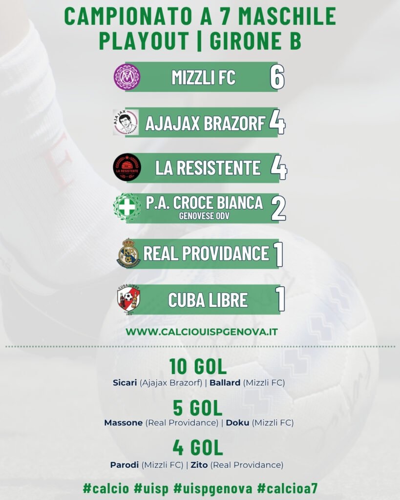 GIRONE B PLAYOUT | Regna l’equilibrio e non mancano le incertezze di classifica anche nel Girone B, che ha proiettato lassù in cima alla graduatoria il Mizzli FC, vincente 6-2 con La Resistente sulle ali della tripletta di Ballard, della doppietta di Doku e del singolo gol di Parodi.