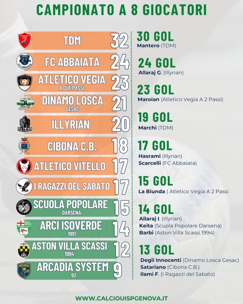 Se mancano ancora da recuperare due gare tra il 27 e il 29 aprile prossimi, dopo lo svolgimento delle ultime gare ci sono tre formazioni già qualificate. Oltre alla capolista TDM, che ha blindato matematicamente la prima posizione che le varrà un posizionamento migliore nel tabellone dei quarti di finale, sono qualificate FC Abbaiata e Atletico Vegia A 2 Passi, fermata lo scorso 7 aprile dall’Aston Villa Scassi 1994 vincente 4-3 nel segno di Barbi (doppietta), Giannelli e Remida.